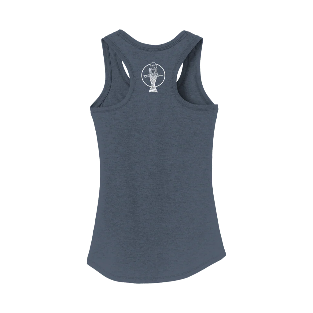 The Women's Siren Tank, a one-of-a-kind Bug Slinger™ design, features a hybrid surf meets dead head inspired graphic across the chest of a navy women's tank top.